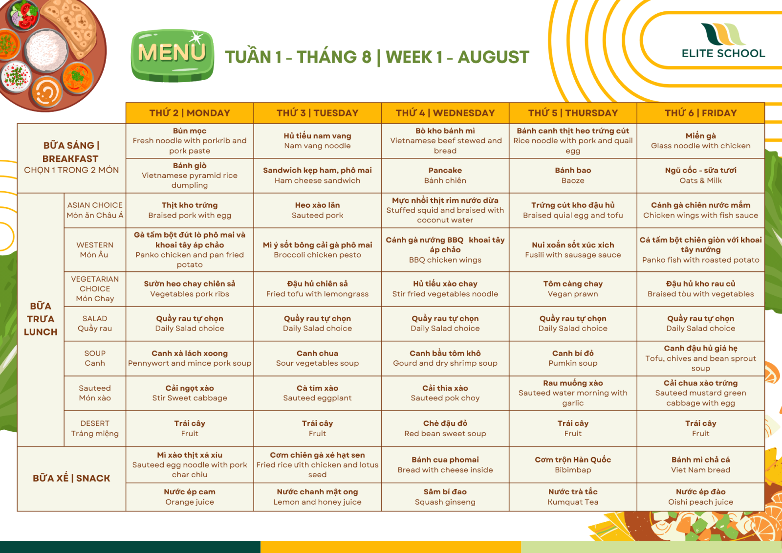 Trường Tiểu học, Trung học cơ sở và Trung học phổ thông Elite xin thông báo về thực đơn dành cho học sinh trong Tuần 1, tháng 8, năm học 2025 - 2026. Quý phụ huynh vui lòng kiểm tra và ghi nhận những trường hợp học sinh dị ứng, không dung nạp được món ăn, thành phần nguyên liệu của món ăn,... cho Giáo viên chủ nhiệm.